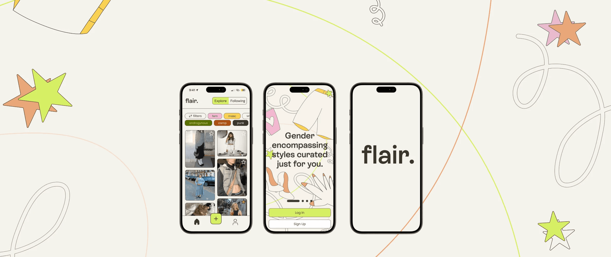 Flair's homescreen divides into "Explore" and "Following" sections. The mosaic-bento feed strikes a balance between readability and content density, highlighting special posts like creator spotlights, suggested styles, and dynamic, inclusive tagging to filter by identity or style.