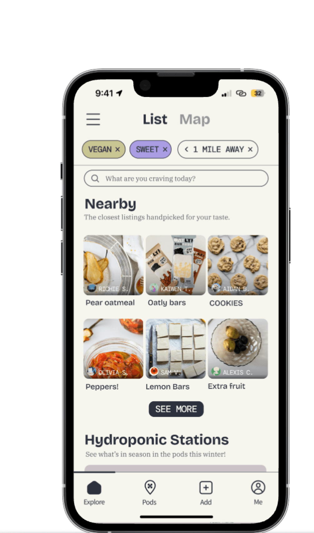 To bring Pod to life, I designed a mobile app that makes food sharing seamless and accessible. The app helps users find and contribute surplus food at designated “pods” in high-traffic transit areas, integrating food access into daily commutes.